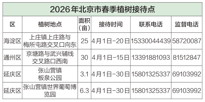 为保障市民便捷参加义务植树,2026年春季,全市共设立植树接待点4处、抚育劳动接待点24处和141个“互联网+全民义务植树”基地。市民可通过电话预约植树和抚育活动;通过“首都全民义务植树”微信公众号,查询“互联网+全民义务植树”基地活动信息,进行预约、签到,活动结束后可在线领取《首都全民义务植树尽责证书》。自行开展阳台绿化等身边尽责活动,且符合《首都全民义务植树尽责形式(2025版)》要求的,可通过公众号“自发尽责”模块,在线申领尽责证书。