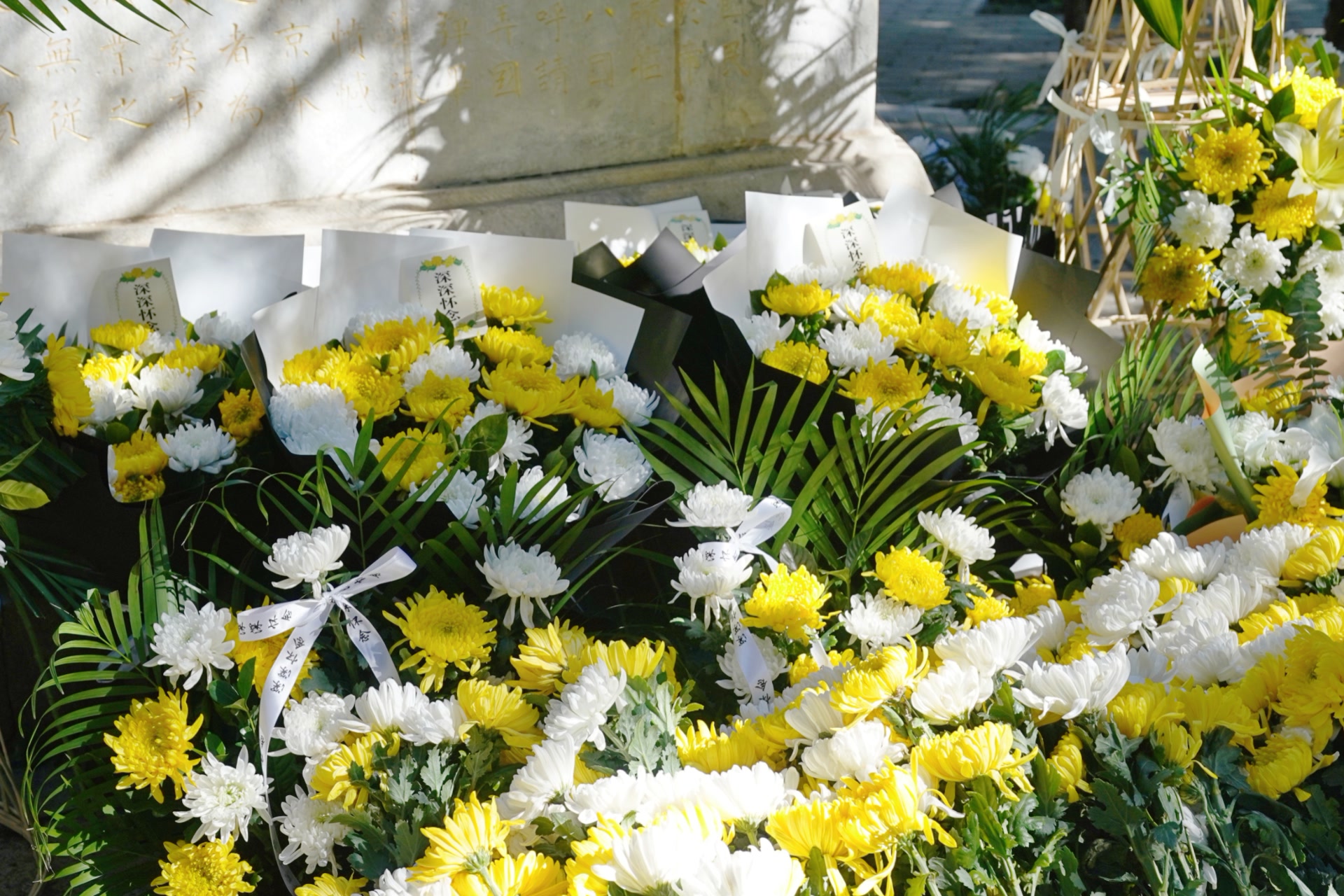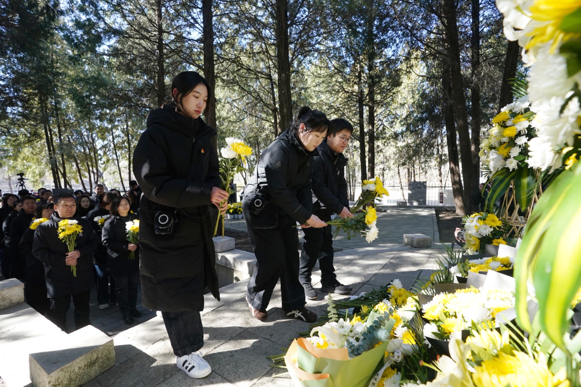 宣讲结束,大家依次上前,敬献鲜花、整理缎带,深情鞠躬致敬。一朵朵白菊轻放在碑前,花瓣在春风中微微颤动。