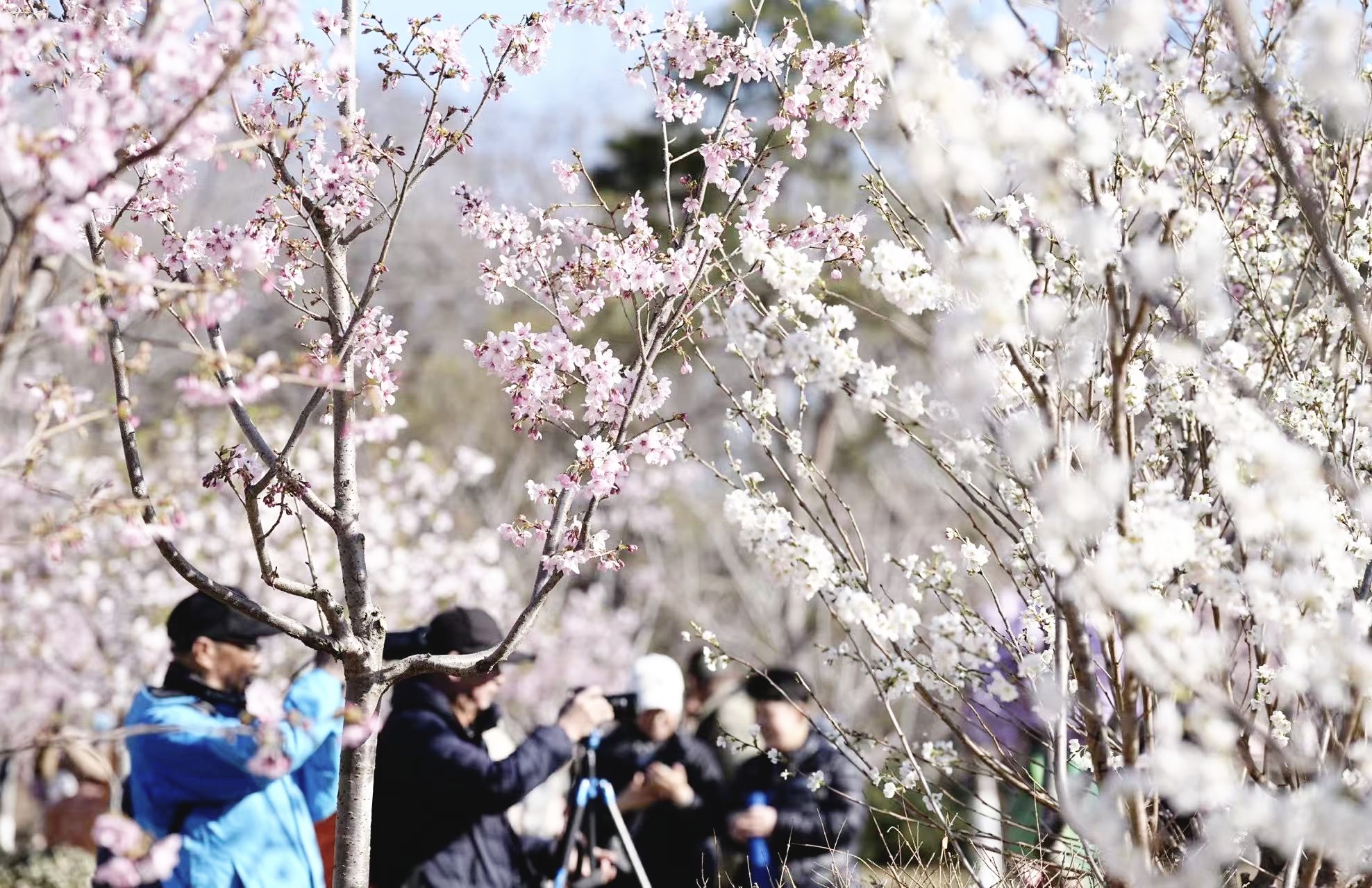 其中最独特的当属公园首次促培展出的早樱品种“香妃”,与“螺蛳粉”樱类似,区别于多数无香樱花,花香浓郁是其最大特色,游客不仅可以近距离观赏鲜艳的花色,还能通过嗅觉感受浓郁的芬芳。一同亮相的还有山东自育品种“名贵红”和少有的两季花品种“奖章樱”。公园工作人员根据不同品种的株型高矮、花期时序、花色差异进行搭配,打造出层次丰富、色彩多样的樱花景观。