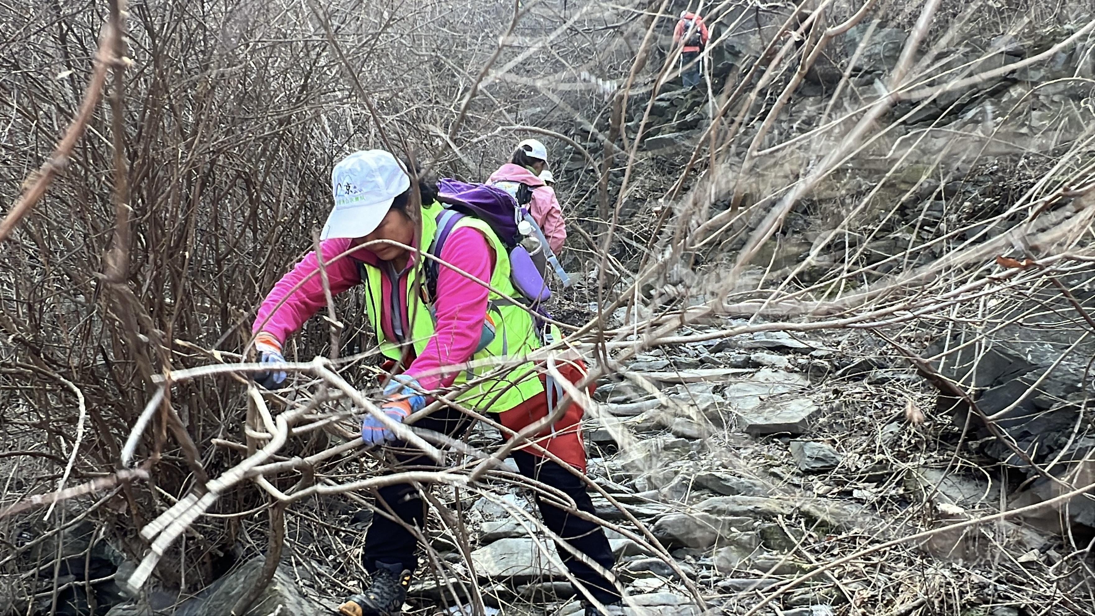 3月15日早上8时,志愿者在东山村集合完毕,携带工具沿山路徒步两公里抵达京西古道东山段。这段古道是京西颇具历史价值的一段,古道以青石铺就,石头经长年人畜行走变得光滑,偶有蹄窝留存。如今,这段古道是户外徒步者登山健身的热门路线,但因常年无人维护,古道被杂草、荆棘、灌木层层覆盖,露出的古道仅剩不到50厘米宽,给徒步游客带来诸多不便。