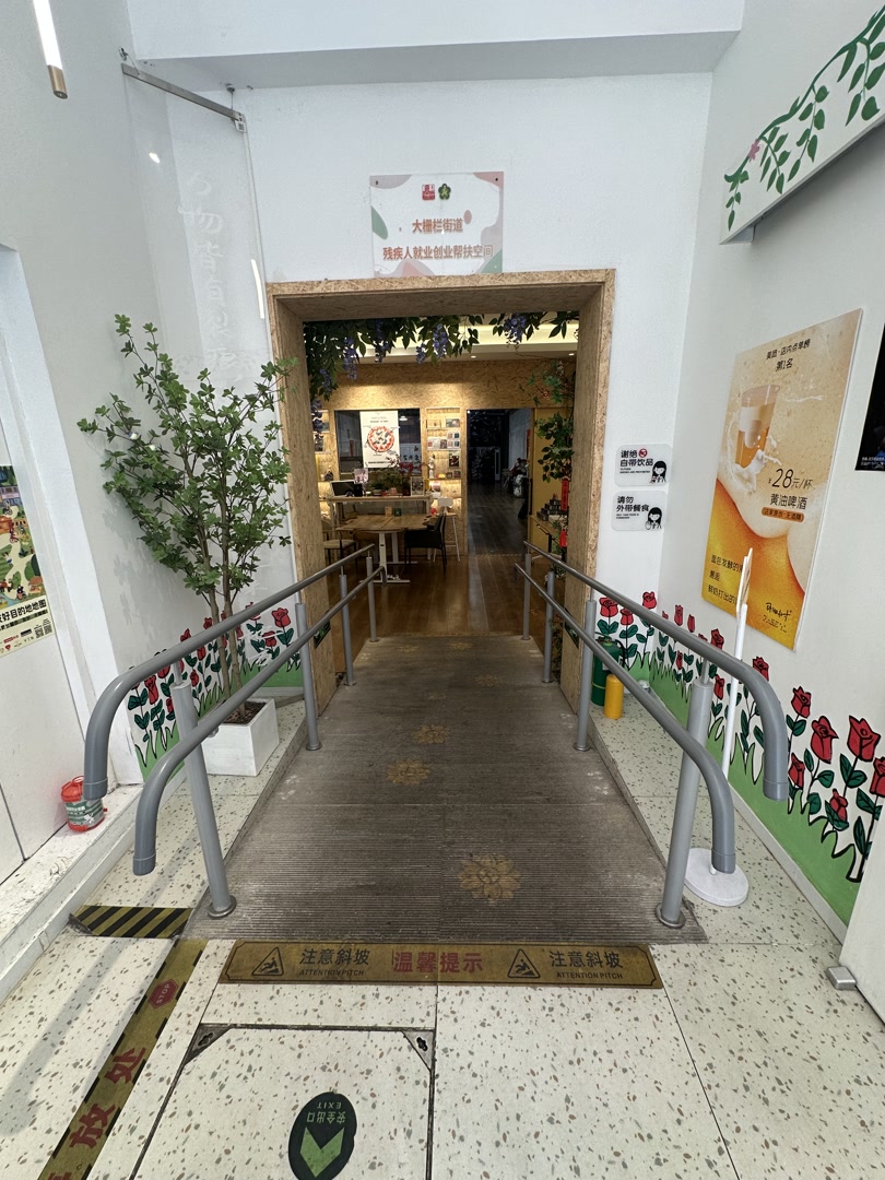 对于视力微弱的视障朋友来说,鲜艳的红色会在一片模糊中带来色彩刺激,门口悬挂的风铃随风作响,更能帮他们准确定位;进店之后,左边墙上一块触手可及的盲文地图,可以让他们清晰了解整个店的布局。对于轮椅人士而言,宽达2米的双开大门向外敞开,门口倾斜的坡道和大门内侧坚固的扶手平行,乘坐轮椅可沿坡而上,扶着把手无缝衔接进店,在专门区域妥善放置好轮椅车头,再沿平缓的坡道顺利到达消费区域。