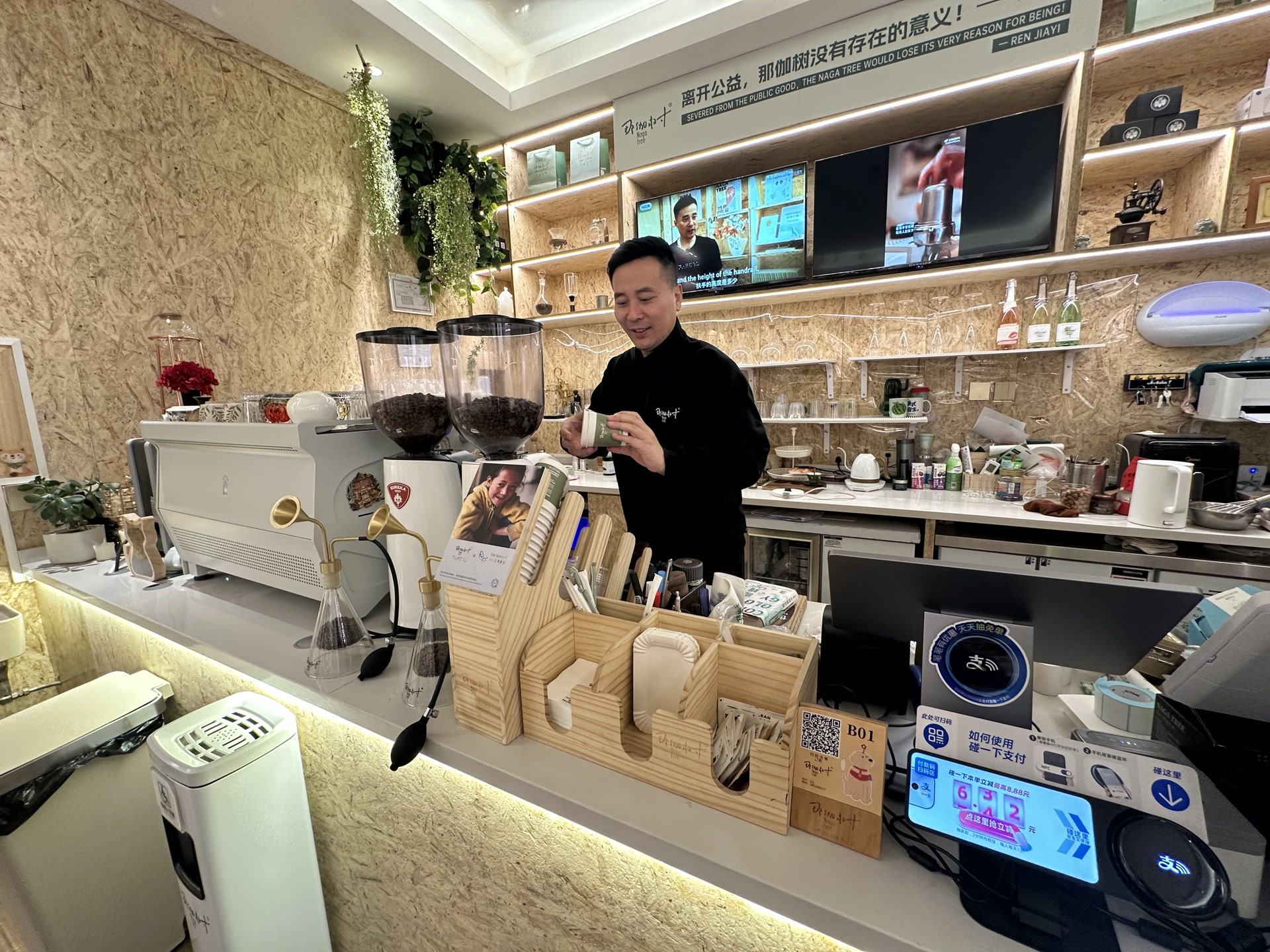 残障人士的就业问题,就是他重点关注的。有残友曾向他反映,即便找到工作,也常因缺乏合适的无障碍环境,连厕所都上不了,坚持了一个月就离职了。“那伽树”有完善的无障碍设施,任家熠也想为残障人士提供就业岗位。“我们店的首批员工里,就有一位听障咖啡师,手艺出众,但我们店受众涵盖各类残障朋友,服务中难免出现不便。”任家熠说,例如盲人顾客遇到洒水等紧急情况求助时,听障店员就无法第一时间回应,“所以我们也在不断测试岗位的适配度,希望每位残障朋友都能找到合适自己的岗位。”