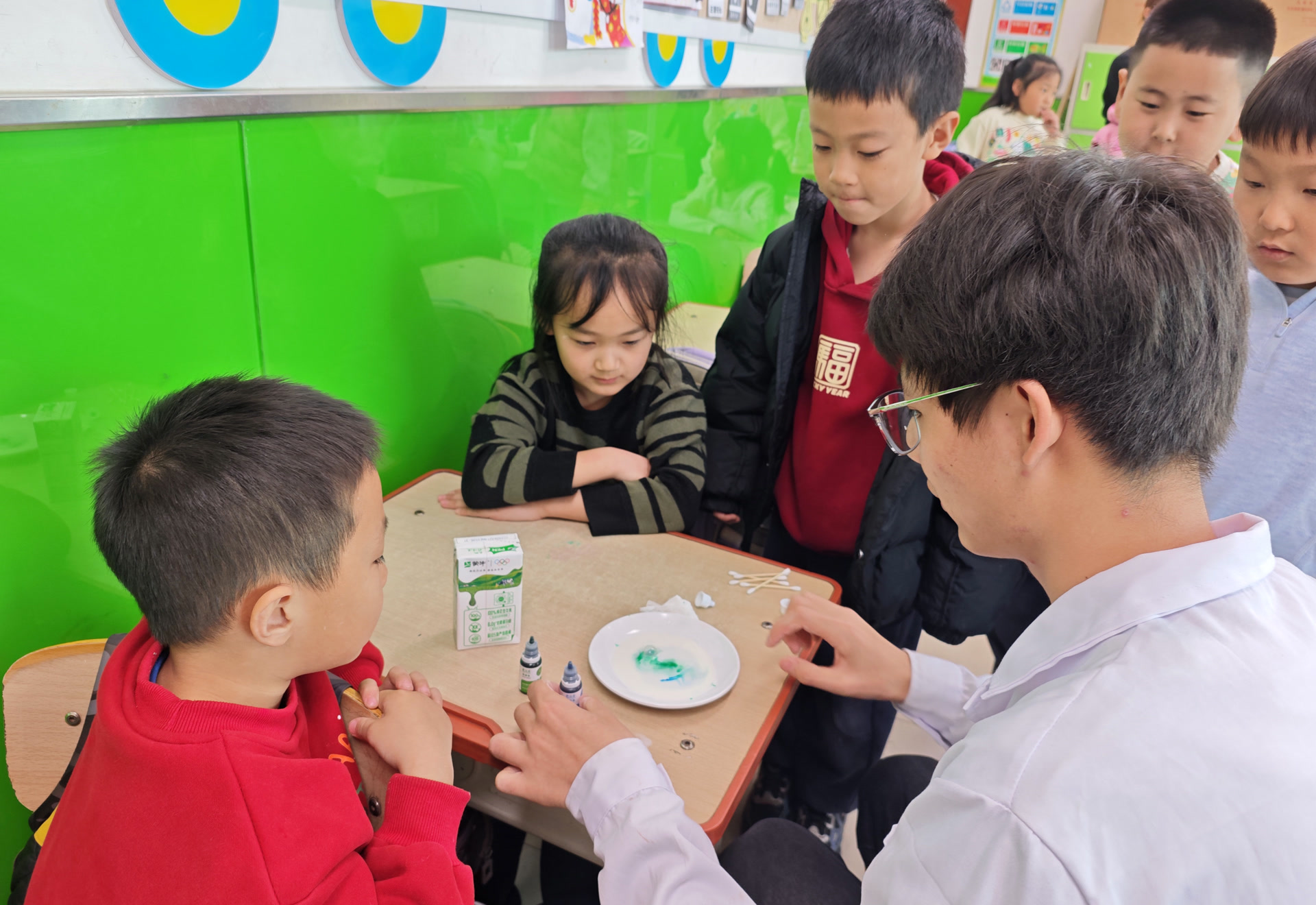 在科普实验环节,科普引航员们化身为“科学魔法师”,带领孩子们体验牛奶彩虹画、变色的小纸条、神奇的紫甘蓝指示剂、火山爆发、水中珊瑚礁等趣味实验,并且手把手指导大家调配材料、进行操作、观察变化,耐心解答孩子们提出的各种疑问,让科学的种子在孩子们心中悄然生根。