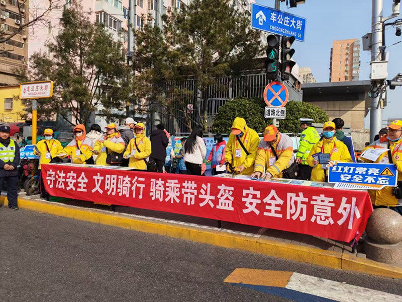 3月21日上午,西城区引导员走进官园桥路口西北角,联合交警共同开展交通安全宣传活动。他们向等候红灯的自行车、电动自行车骑行人员递上宣传手册,耐心讲解新规要点:“5月1日起,驾驶、乘坐电动自行车都必须规范佩戴安全头盔,驾驶电动自行车须年满16周岁;同时也提醒大家,骑自行车须年满12周岁。”一位外卖小哥接过宣传页认真阅读后说:“头盔我天天都戴,但不少新规细节还真不清楚,谢谢你们的提醒。”