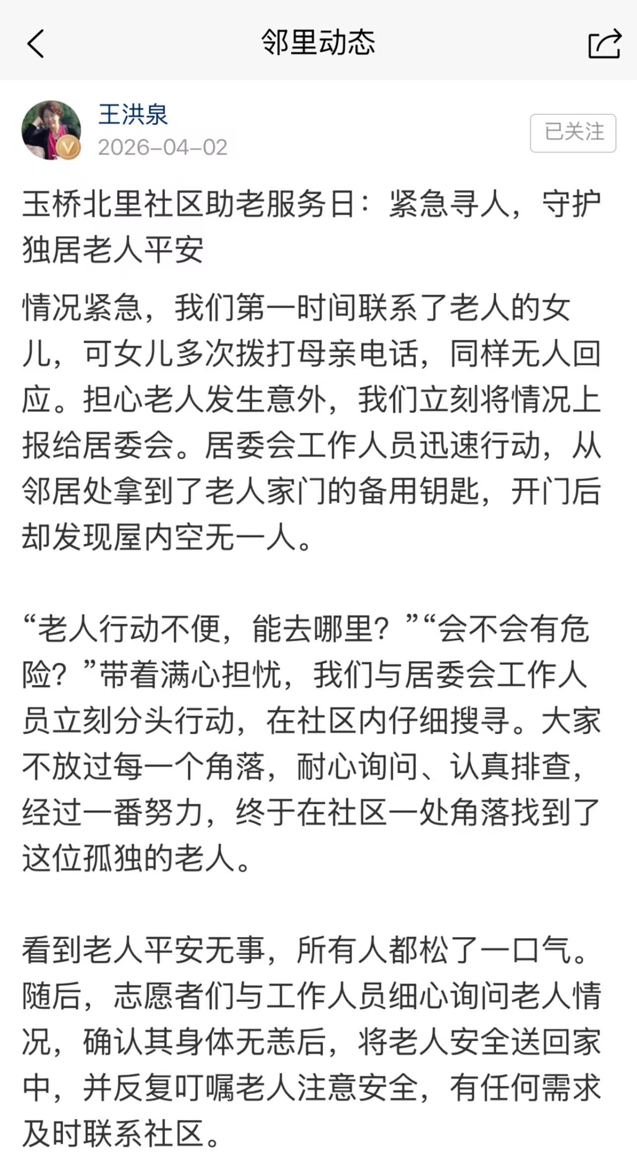 前几天,通州玉桥北里社区发生了一件暖心事:助老队按约定时间上门探望,敲门后却无人应答,这下可急坏了志愿者们。随后,热心邻居、志愿者和社区工作人员接力寻找,终于找到了老人。虽说是虚惊一场,却让老人感受到了被惦记的温暖。