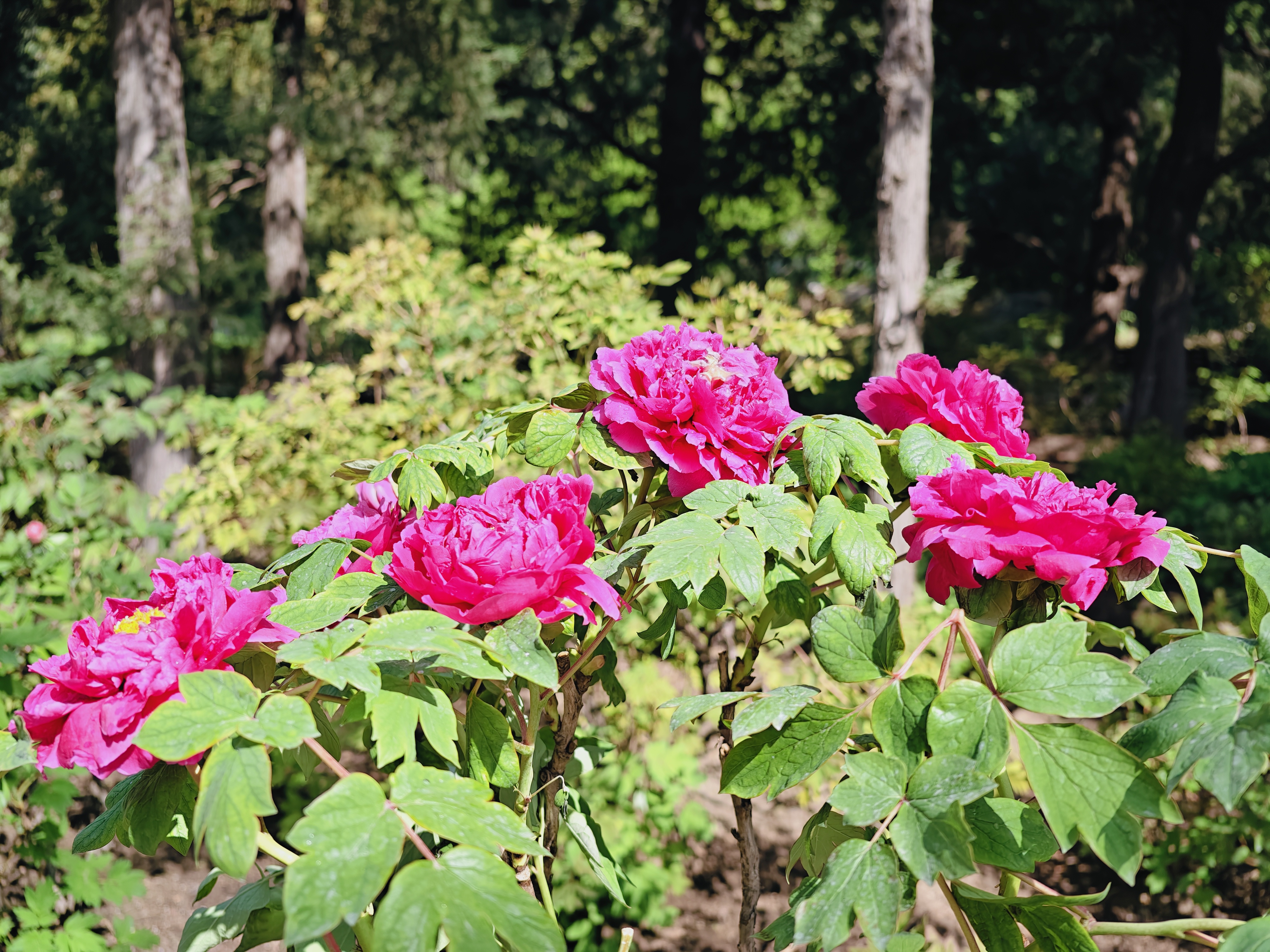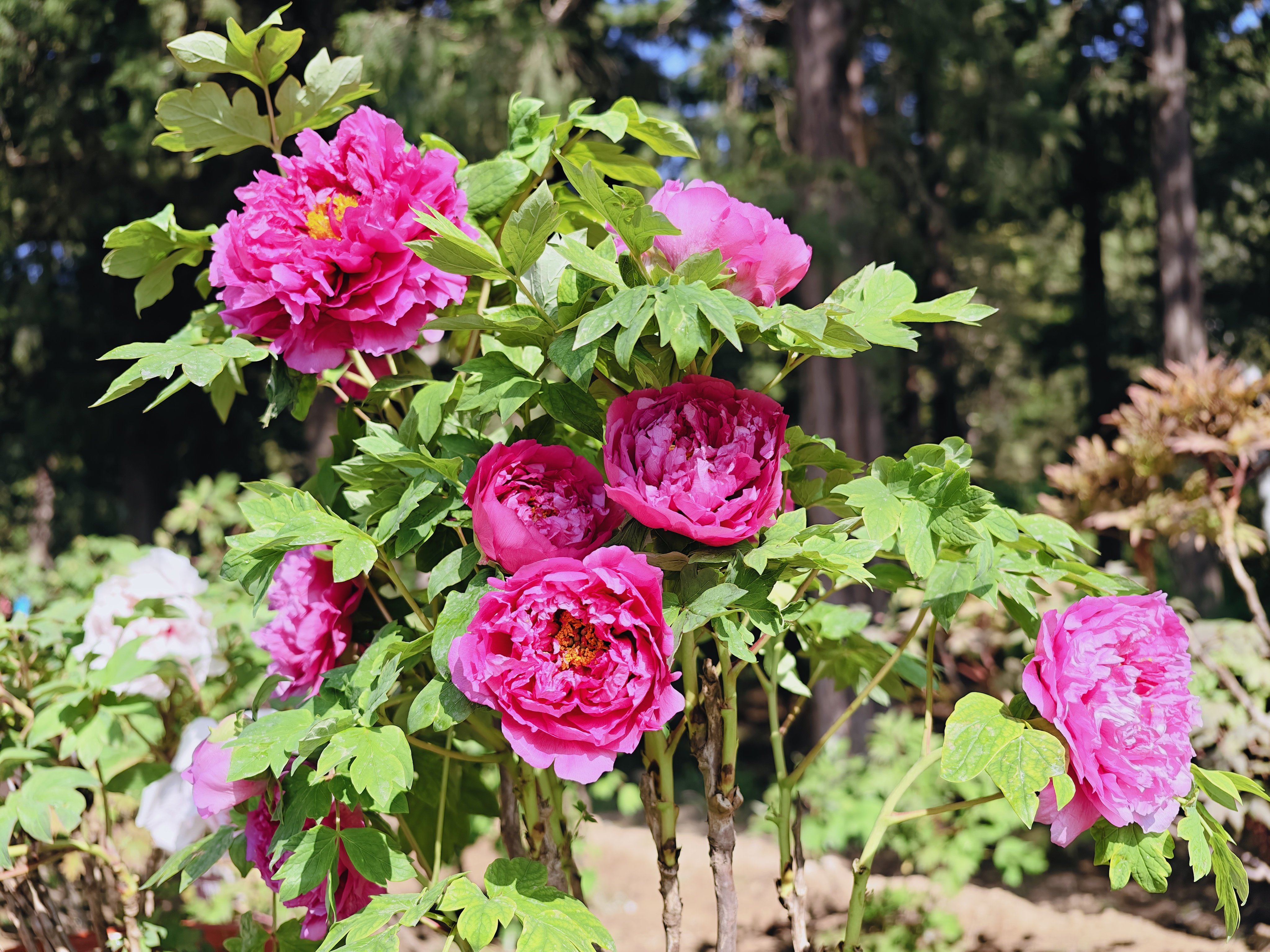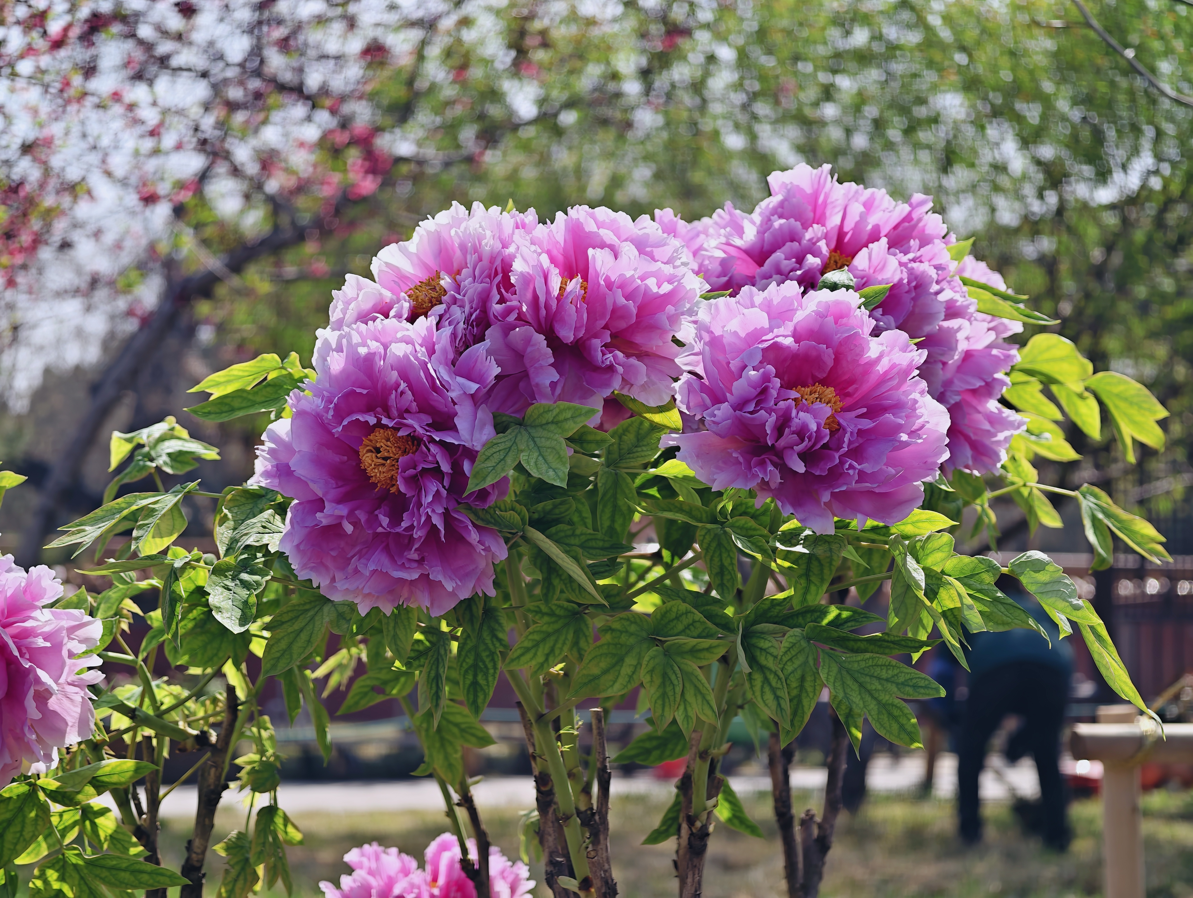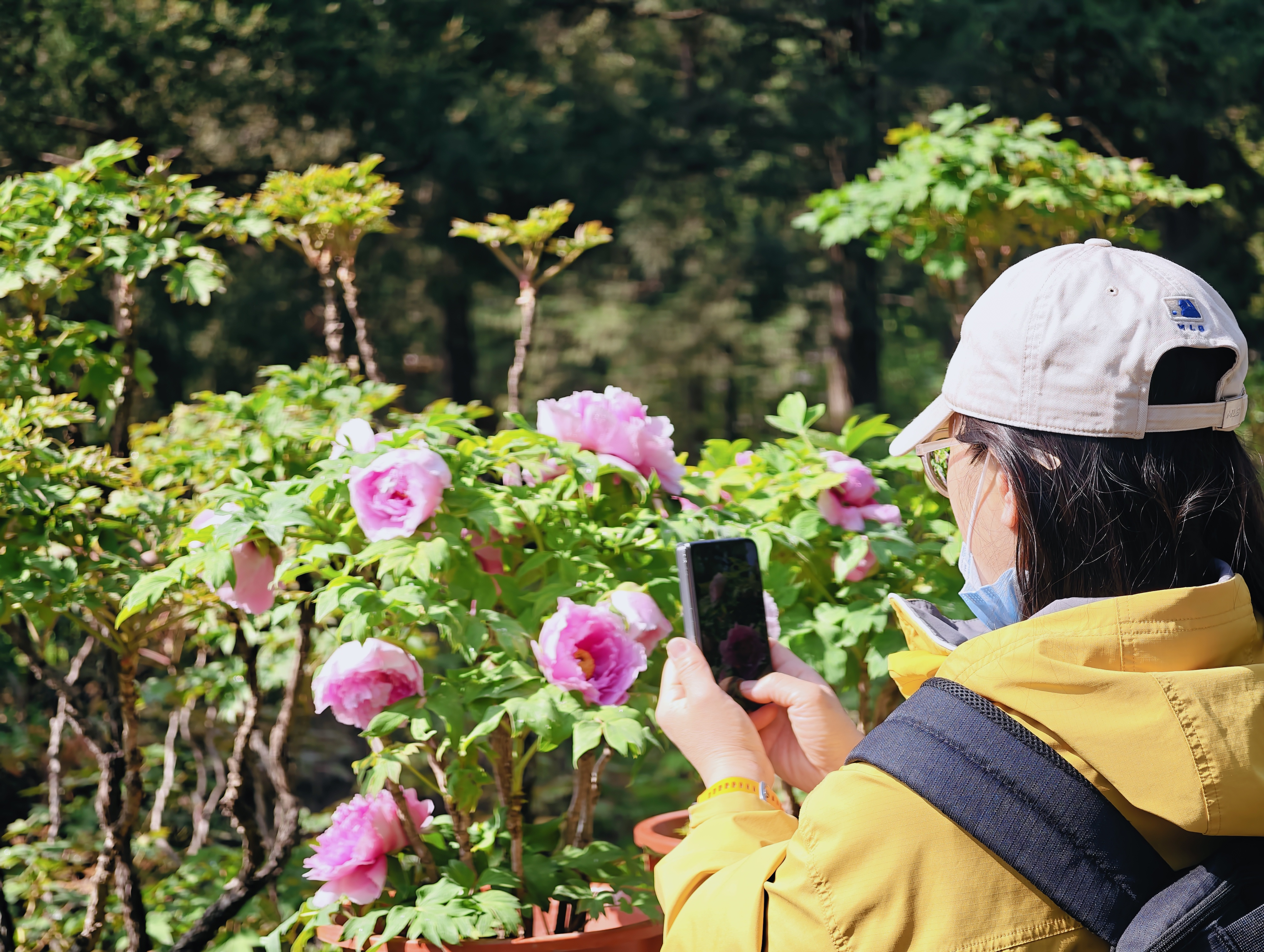 这些促培牡丹花型饱满,花色艳丽,涵盖近20个品种,包括“富贵满堂”“卷叶红”“蓝月亮”“迎日红”等。其中,传统名品“乌龙捧盛”与“紫二乔”,以及备受游客喜爱的“绿幕隐玉”,均位列其中。促培牡丹与园内同期盛放的西府海棠、丁香、紫荆、美人梅等时令花卉相互映衬,共同构成一幅绚丽的春日画卷。