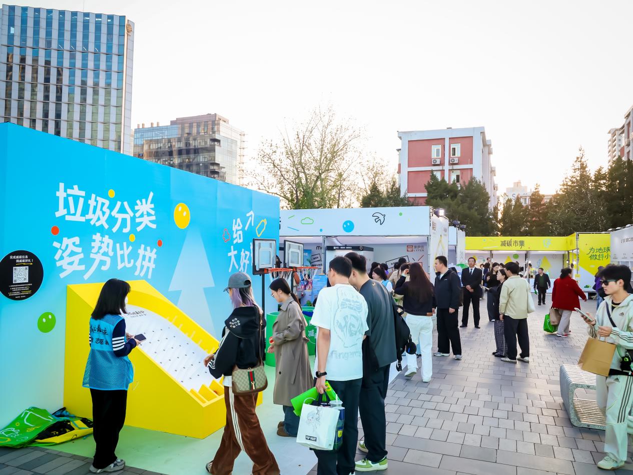 为提升市民垃圾分类的参与热情,本次“减碳嘉年华”北京站活动嘉年华创新打造了“回收/互动—积分—商圈消费”闭环。市民投递可回收物后,既可提现环保金,也可兑换三里屯商圈商户消费券,使减碳行为获得即时、可感的回报。现场还设置了品牌快闪、环保市集、互动打卡、回收兑换等体验环节与低碳互动游戏,让市民边学边玩,推动形成绿色低碳消费新风尚。