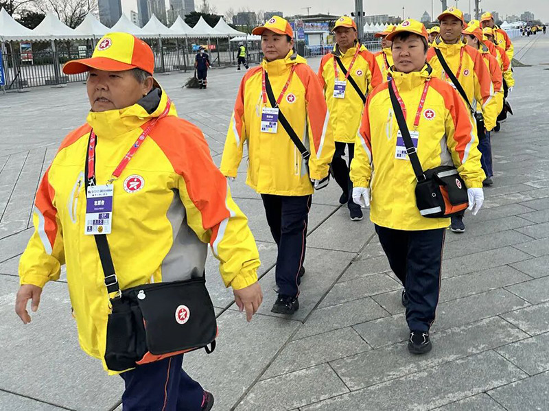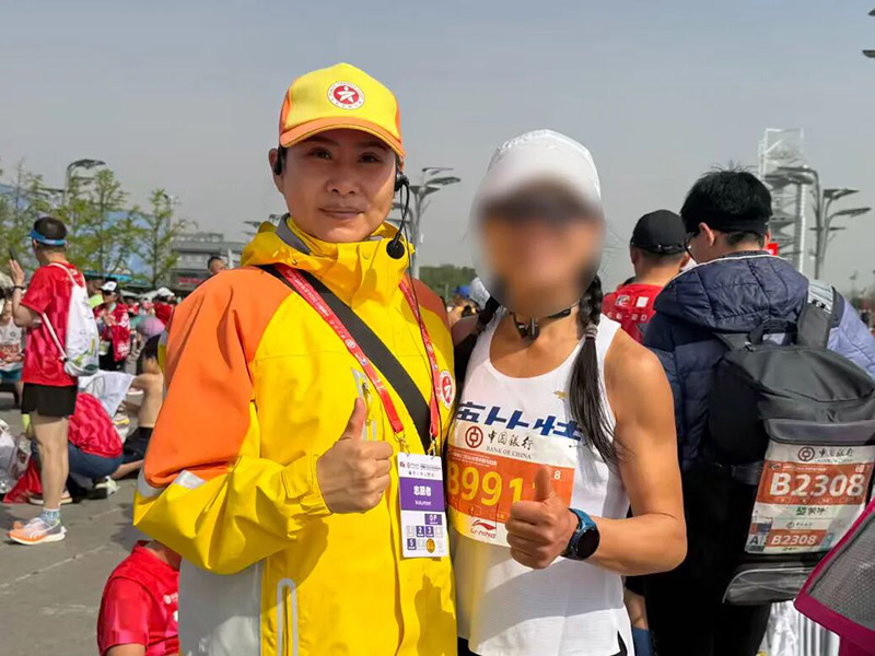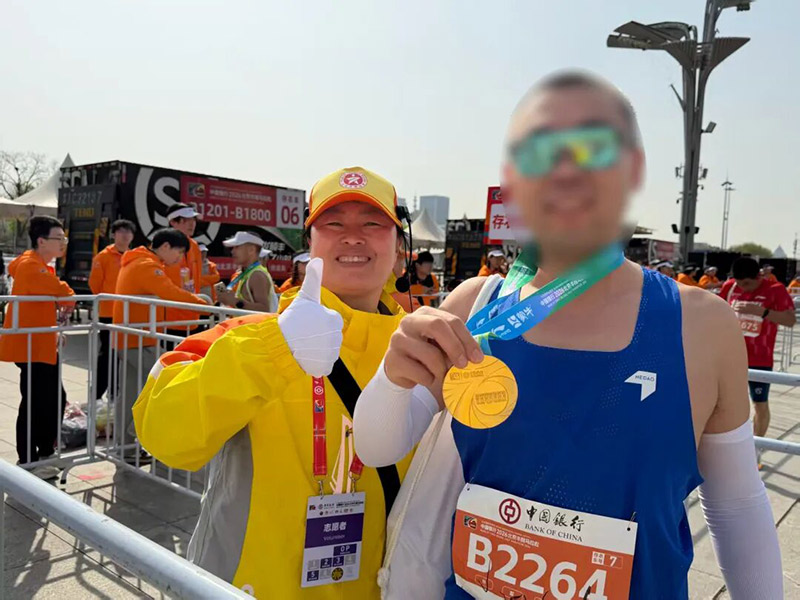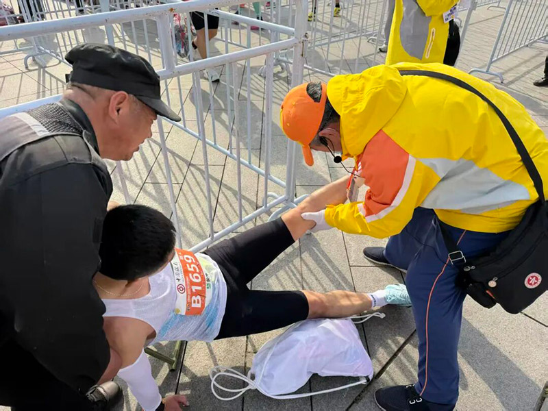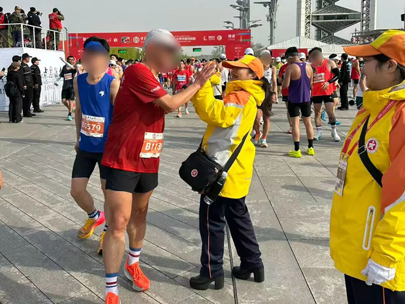 随着完赛选手陆续抵达,终点区域人流渐增。引导员主动上前击掌鼓劲,送上“恭喜完赛”“您辛苦了”的暖心祝福;遇选手腿部抽筋、肌肉痉挛,及时帮扶按摩、安抚情绪,并联动红十字会人员开展应急处置。他们始终耐心细致,按需服务,保障现场疏散顺畅有序。