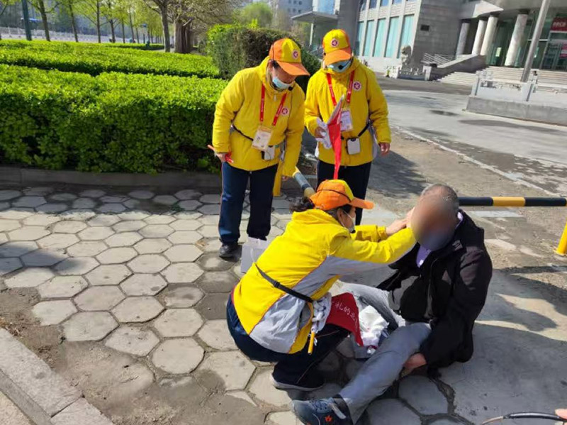 “别着急,我们陪着您。”赵艳半蹲在老人身旁,一边轻声安抚,一边仔细查看伤口并进行初步止血。老人因摔倒受到惊吓、情绪紧张,引导员们便放缓语气,耐心陪伴宽慰。
