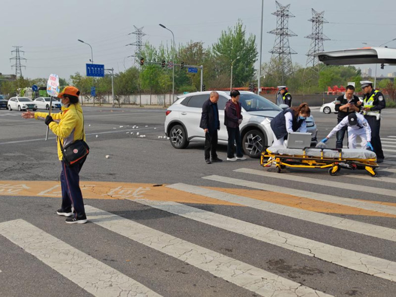 事发瞬间,在路口值守的公共文明引导员田玉玲、郭军第一时间发现险情,立即冲上前处置。两人快速分工:一人疏导车流行人,设置临时安全区域,防止二次事故;另一人上前查看,发现男子被车轮牢牢压住,无法动弹。