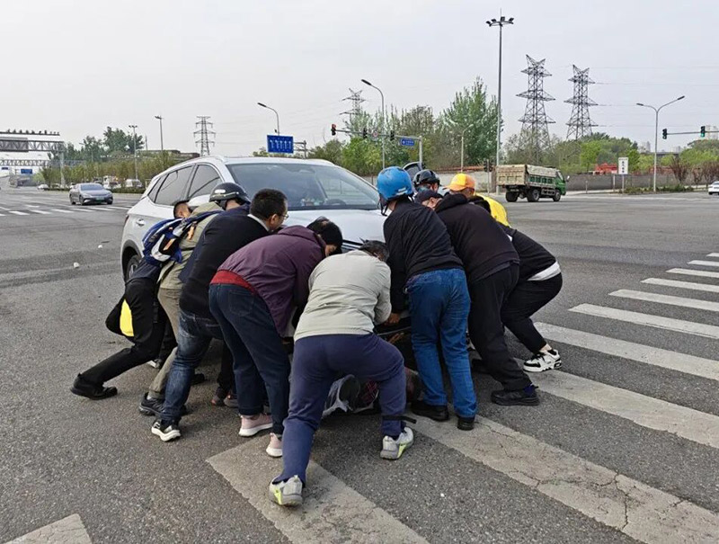 4月19日早高峰,石景山区古城南街与人民渠交叉路口发生一起交通事故,一辆汽车与电动车相撞,骑电动车男子不幸被卷入车底。危急时刻,公共文明引导员、公交车司机与热心路人迅速集结,合力抬车展开生死救援。