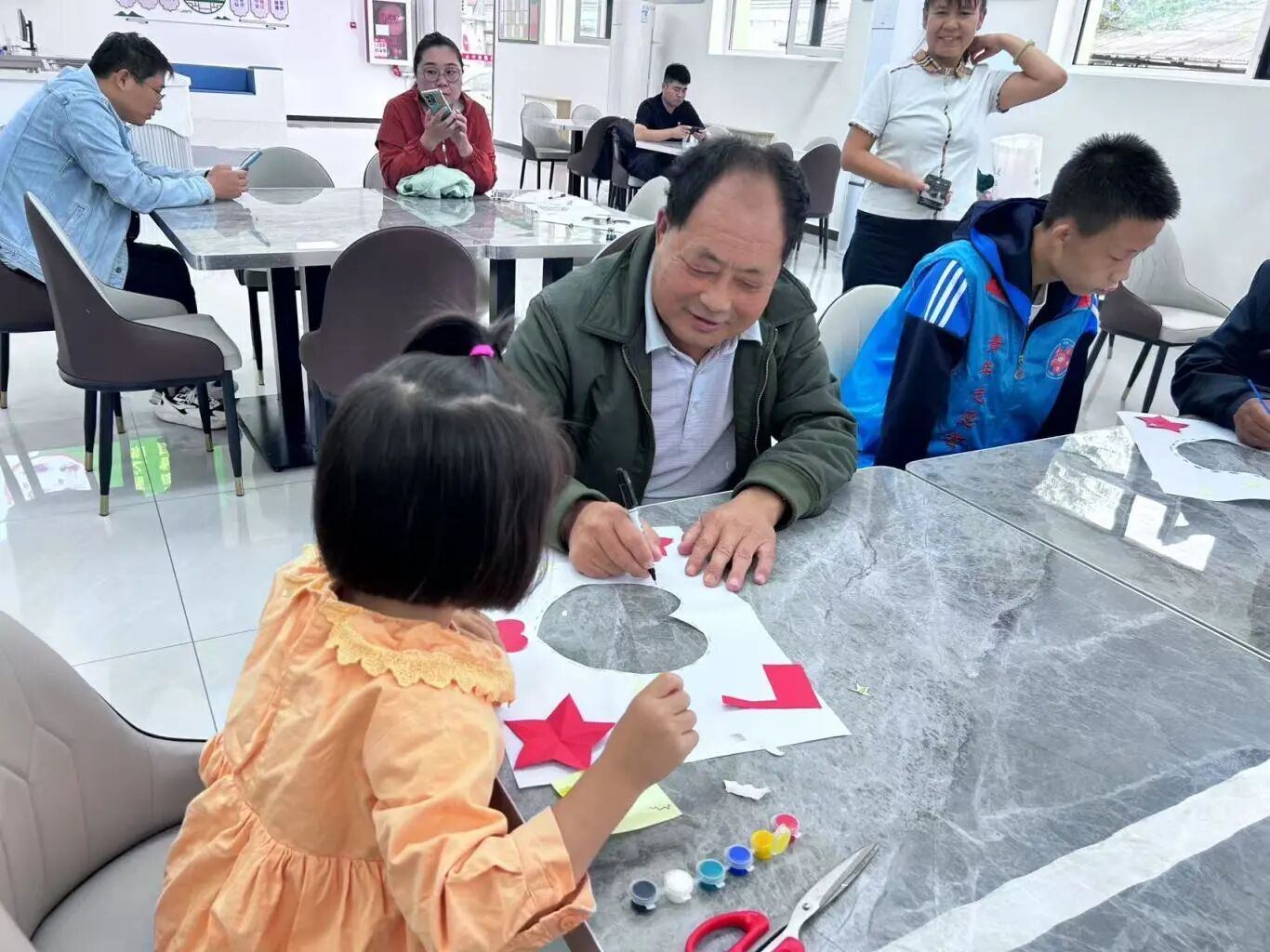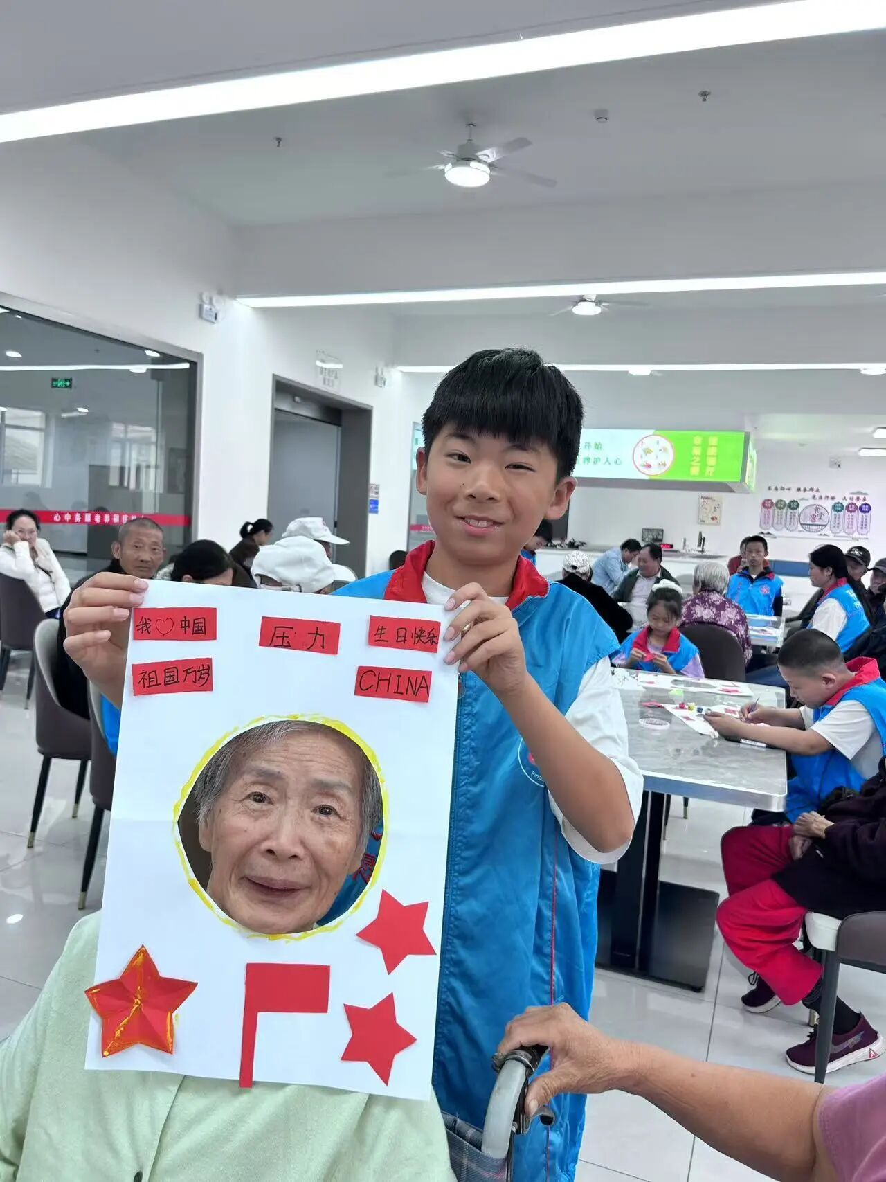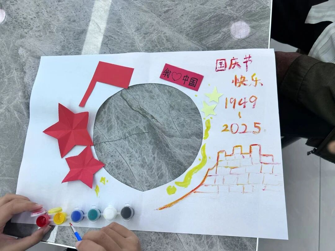 活动在轻松愉快的氛围中拉开帷幕。DIY扣画制作环节吸引了老人们的浓厚兴趣,大家围坐一堂,手持画笔与贴纸,眼中闪烁着期待的光芒。青少年志愿者们细心陪伴在旁,耐心讲解绘画技巧,协助老人完成一幅幅以国庆为主题的创意作品。