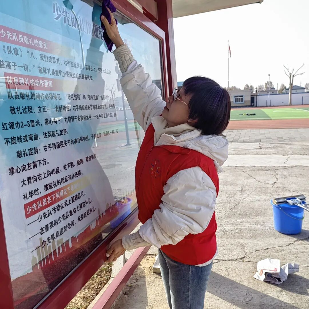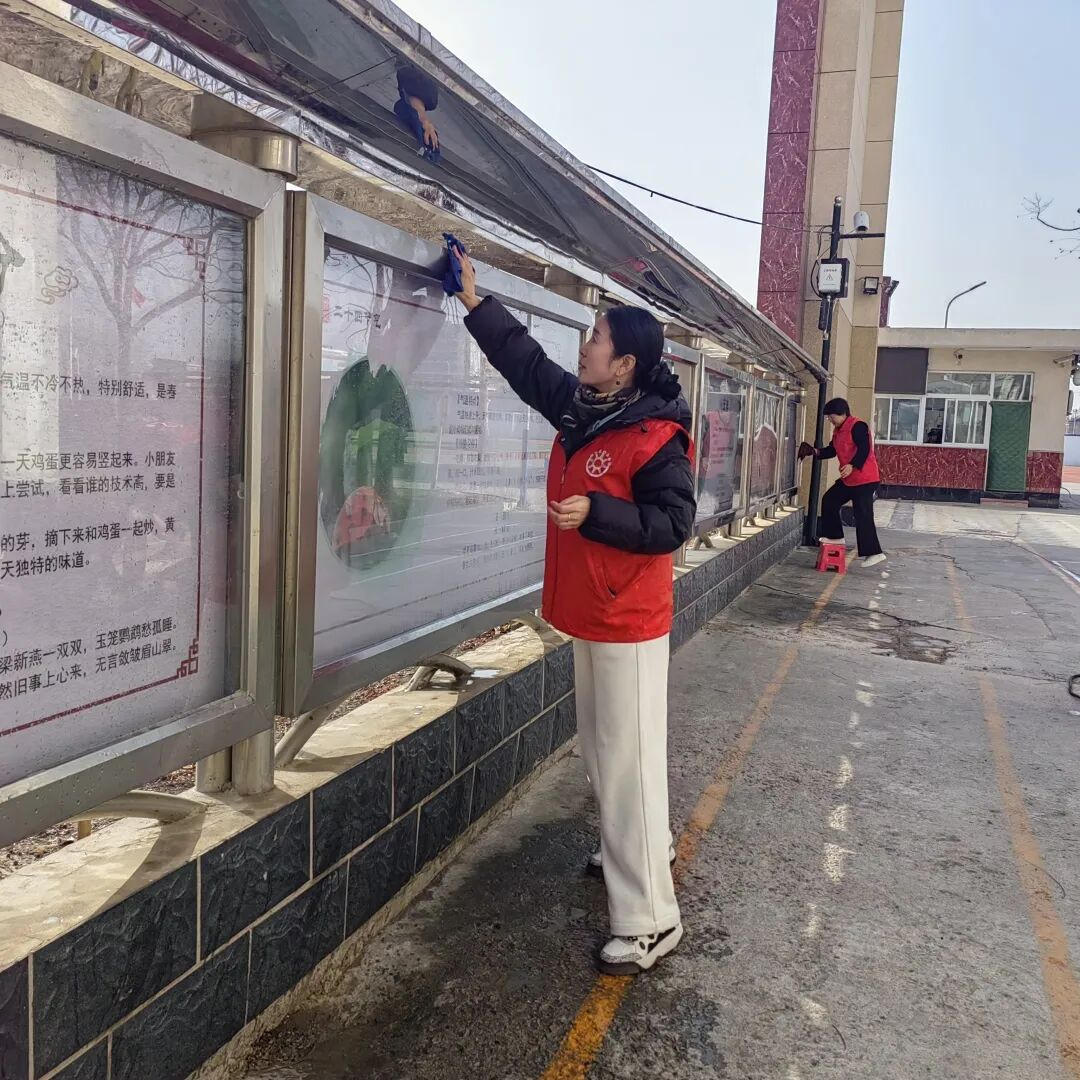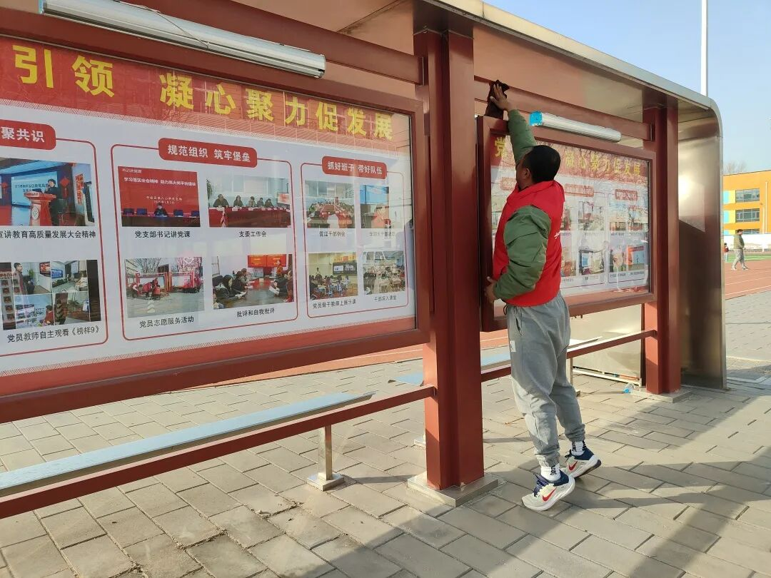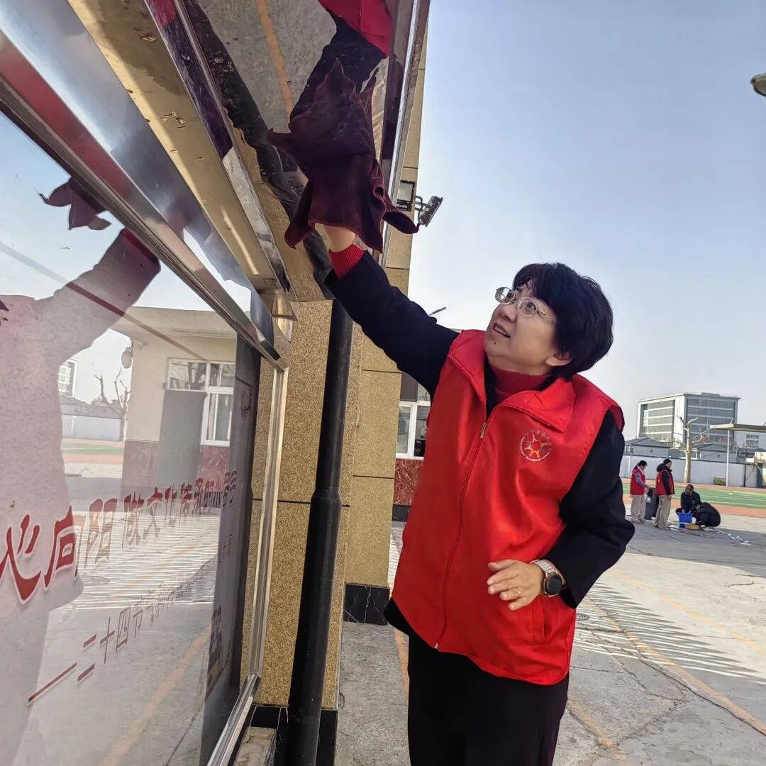 冬日的阳光洒在校园里,党员教师们忙碌的红色身影穿梭在各个橱窗之间,构成了校园中温暖动人的风景线。擦玻璃时飞溅的水珠、额头上渗出的细密汗珠,都成为了奉献精神的生动注脚,充分展现了共产党员“不怕脏、不怕累”的优良作风。
