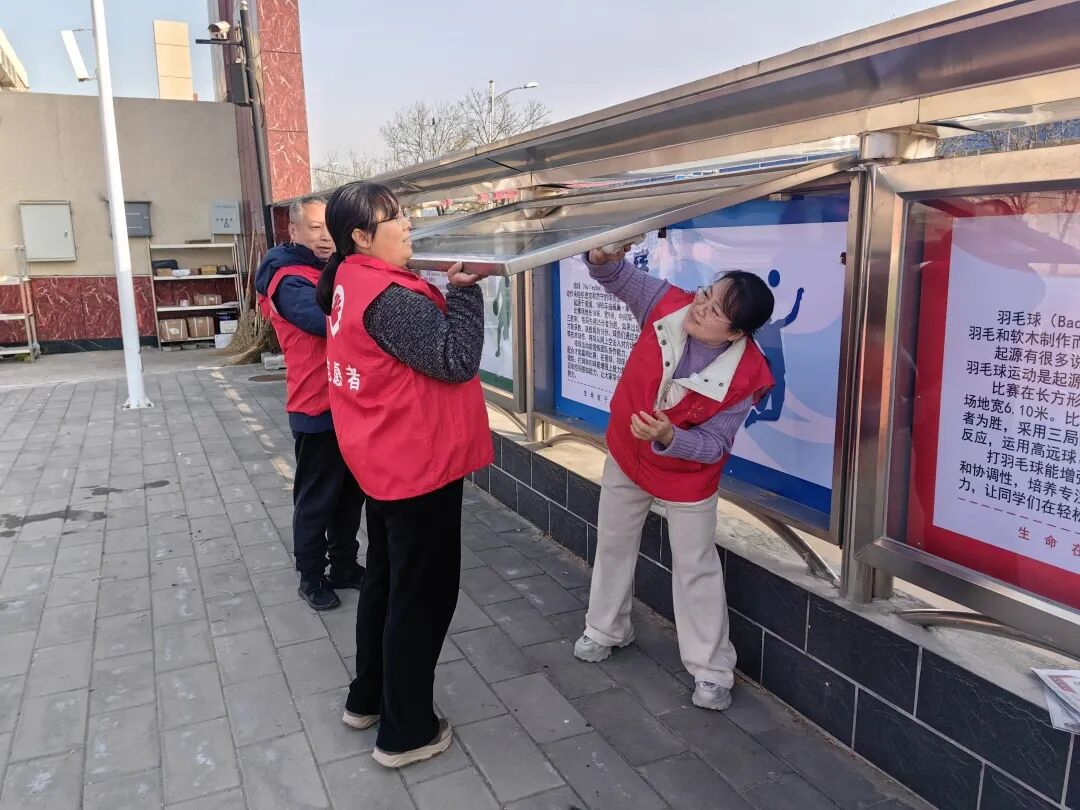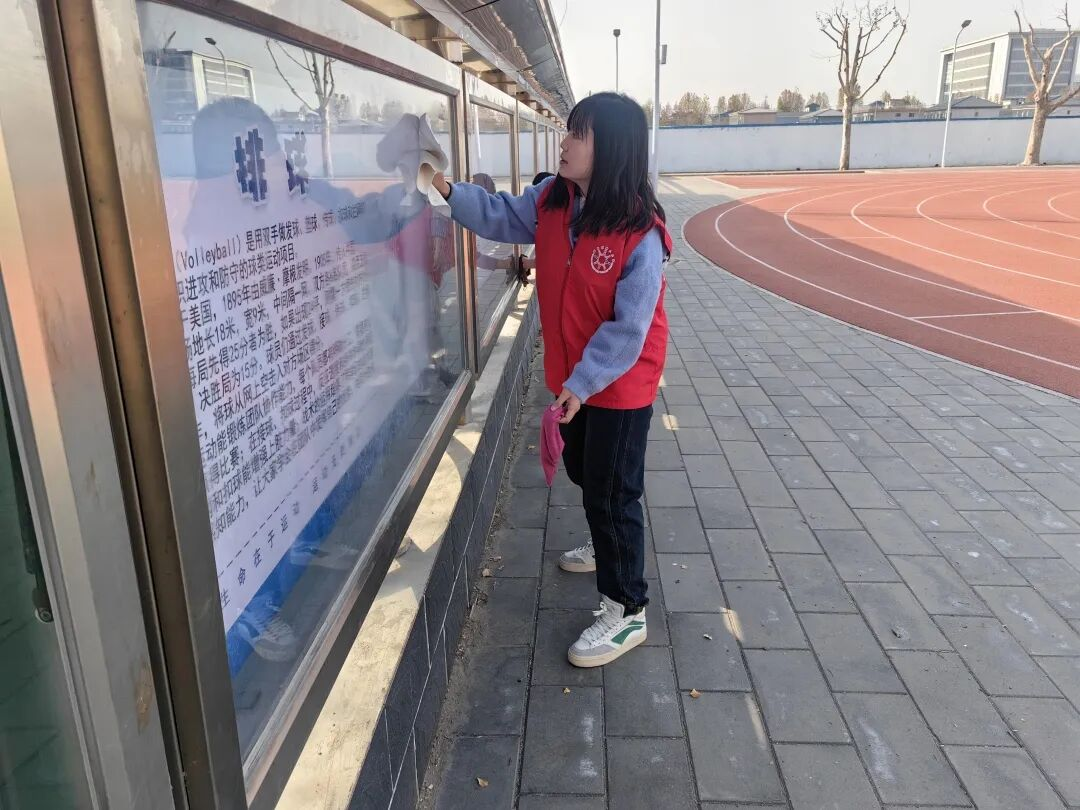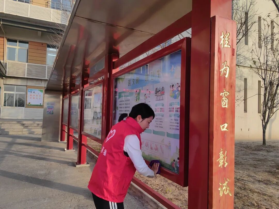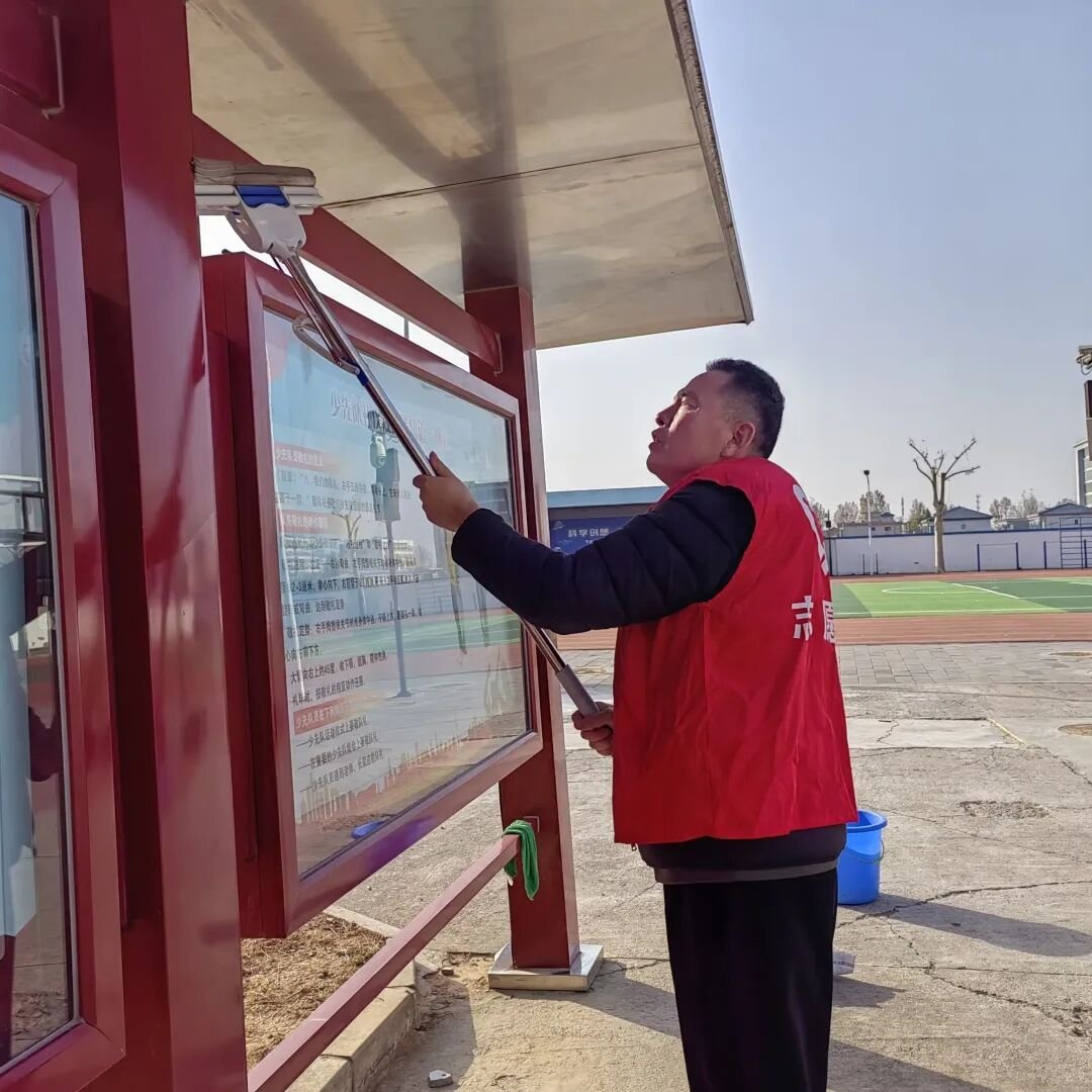 活动中,党员教师们自带抹布、水桶、清洁剂等工具,根据校园橱窗的分布情况合理分工,有的俯身擦拭橱窗边框的积尘,有的踮脚清理玻璃上的顽固污渍,有的则细心擦拭宣传展板。