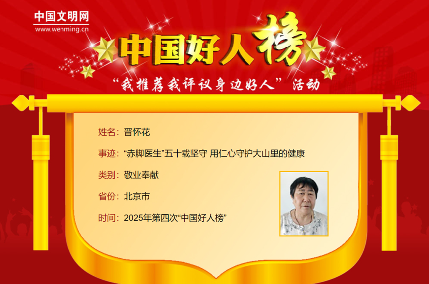 晋怀花,女,1956年11月生,中共党员,北京市房山区十渡镇平峪村卫生室医生。50年来,她背着药箱行走10万余公里山路,服务1600余名村民,磨破100多双鞋,始终坚守在20平米的村卫生室。从“小花大夫”到“晋奶奶”,她用半个世纪践行“健康守门人”的誓言。