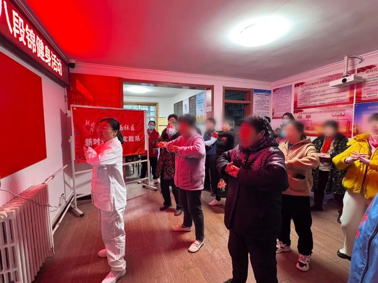 讲座结束后,我院中医护理骨干杨董惠现场教学八段锦,逐招拆解动作要领,耐心纠正姿势,带领居民一同练习这套简单易学、适合日常的中医养生功法,引导大家通过传统健身方式增强体质。同时,志愿者们还为居民测量血压、发放健康宣教手册,普及常见病预防、日常保健等知识,让科学养生理念入脑入心。