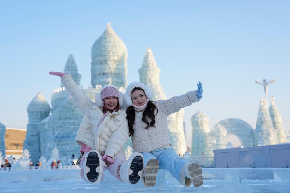 在哈尔滨冰雪大世界,来自世界各地的游客在“冰雪王国”感受冬日限定快乐。