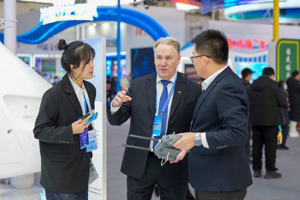 1月6日,在2026哈尔滨国际冰雪经济博览会现场,参会嘉宾(中)在了解一款工业无人机的参数和性能。新华社记者 王松 摄