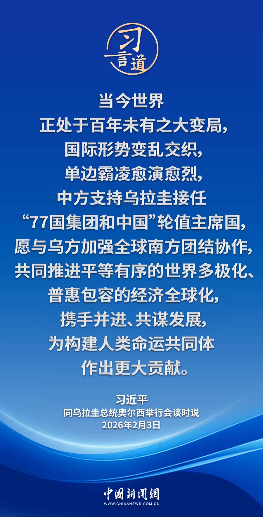 2月3日,国家主席习近平在北京人民大会堂同来华进行国事访问的乌拉圭总统奥尔西举行会谈。习近平指出——